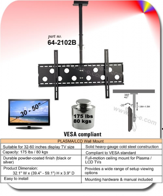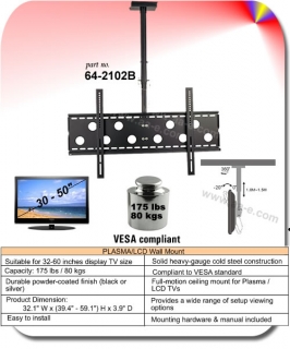 Full-Motion Ceiling Mount for Plasma/LCD TVs --- Max Load 175 lbs (80 kgs) --- Product Dimensions: 32.1" W x (39.4"-59.1") H x 3.9"D